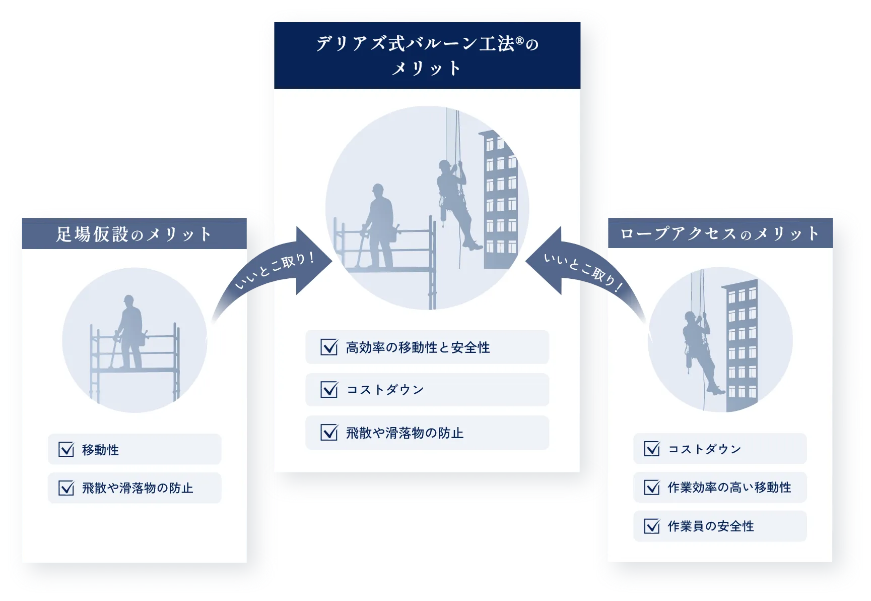 そこで、仮設足場とロープアクセス、それぞれのメリットを組み合わせることで、安全性と効率性の両方を兼ね備えた工法をご用意しました。