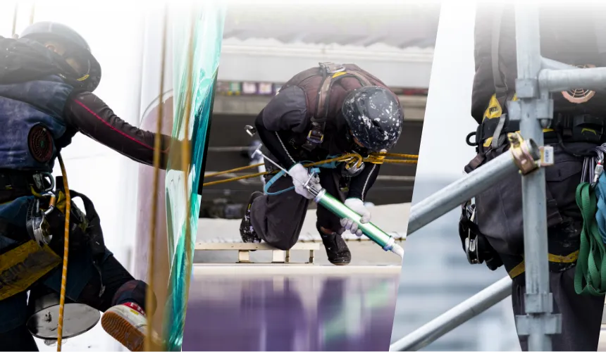 高所や狭小箇所などはロープアクセスで効率的に対応することで、お客様に最大限の費用対効果をご提供しています。
